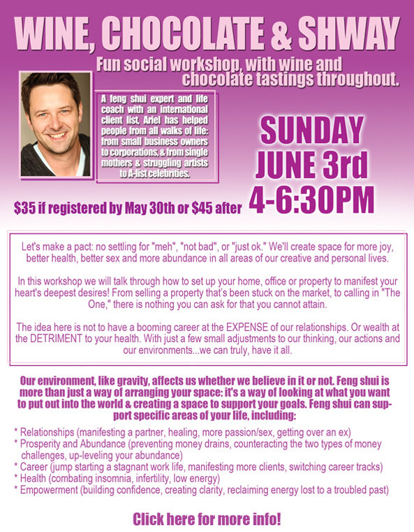 Sunday, June 3rd from 4-6pm! Let’s make a pact: no settling for “meh”, “not bad”, or “just ok.” We’ll create space for more joy, better health, better sex and more abundance in all areas of our creative and personal lives. In this workshop, we will talk through how to set up your home, office or property to manifest your heart’s deepest desires!